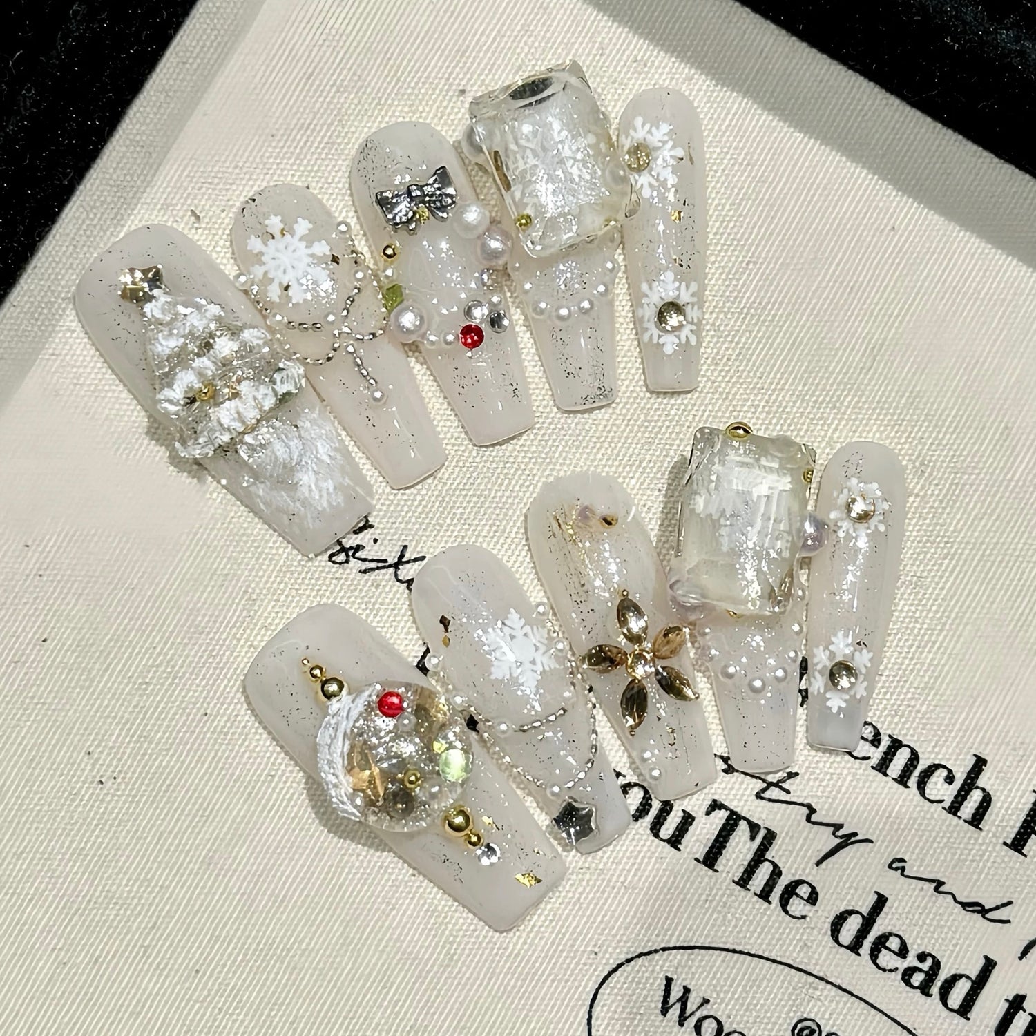 Embrace the magic of winter with these elegant press-on nails. A creamy ivory base is adorned with delicate snowflakes, a shimmering silver bow, and festive golden baubles for a touch of holiday glamour.